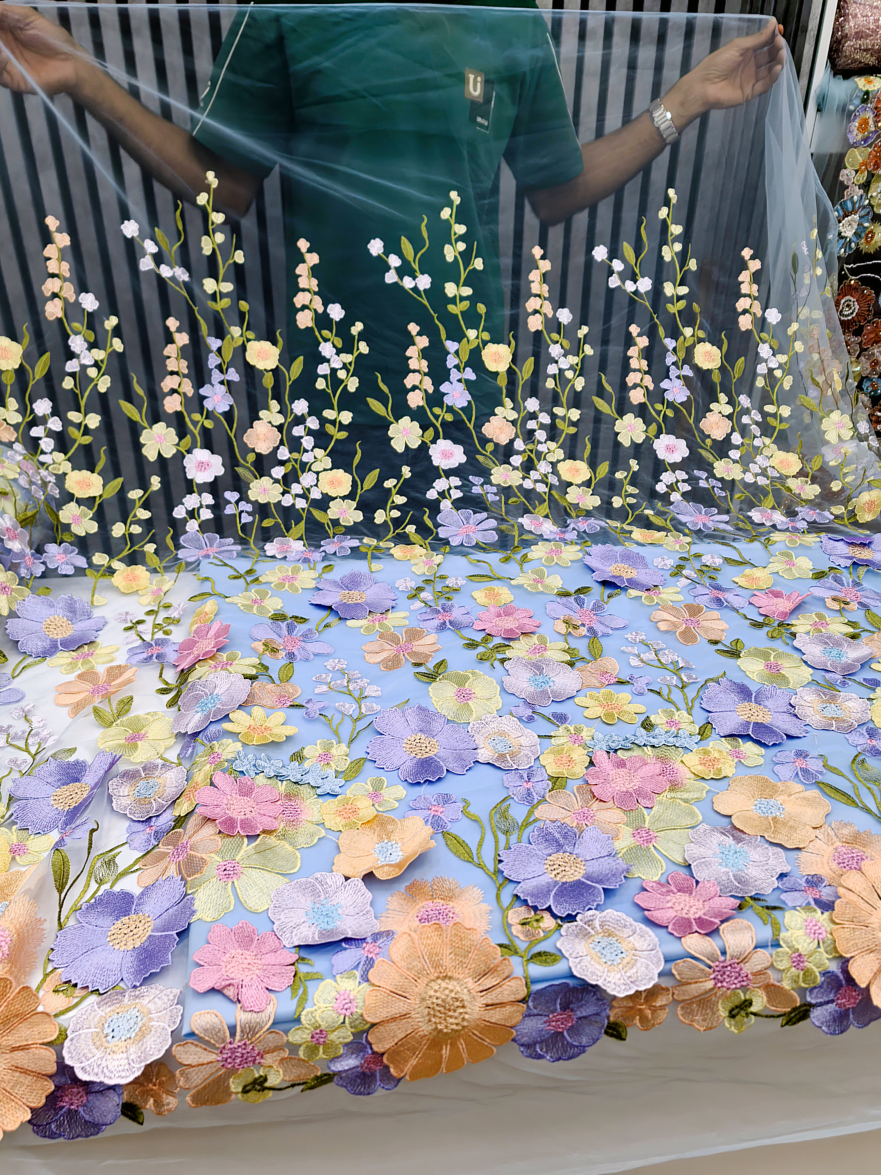 پارچه تور اپلیکه گلبرجسته رنگ آبی آسمانی